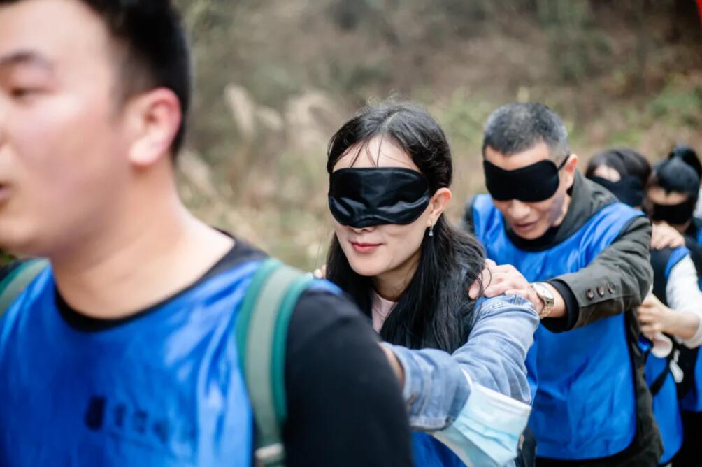 團(tuán)隊(duì)蒙眼前行,由領(lǐng)隊(duì)一人指引方向。