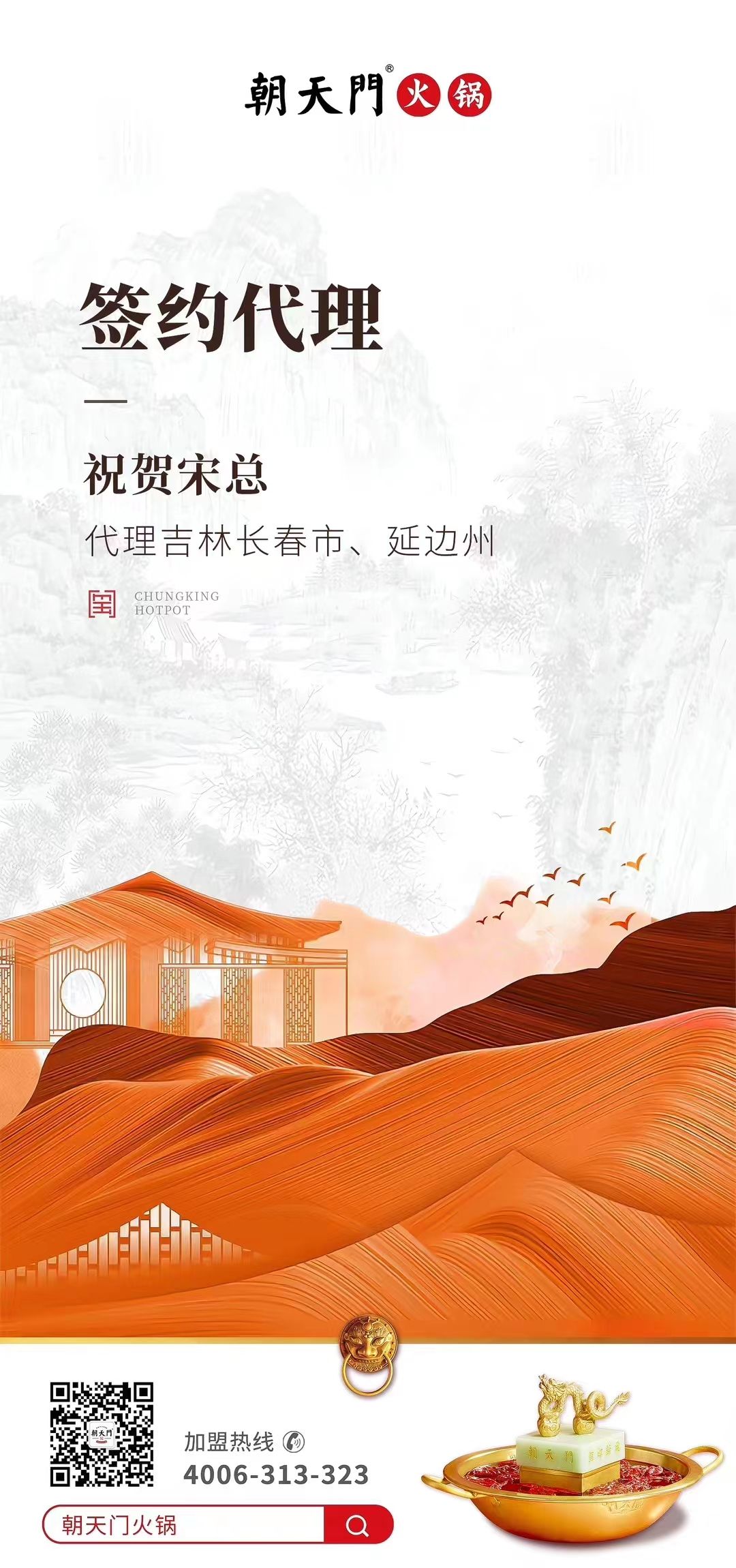 宋總慧眼如炬,用強大洞悉力充分挖掘,朝天門火鍋品牌價值,所以才毫不猶豫拿下朝天門火鍋吉林長春市、延邊市的代理權(quán),朝天門品牌的市場名氣和雄厚實力,也能給予宋總?cè)谭龀?,在這里,我們要再次感謝宋總的信任和支持,預祝宋總生意興隆,財源不斷!